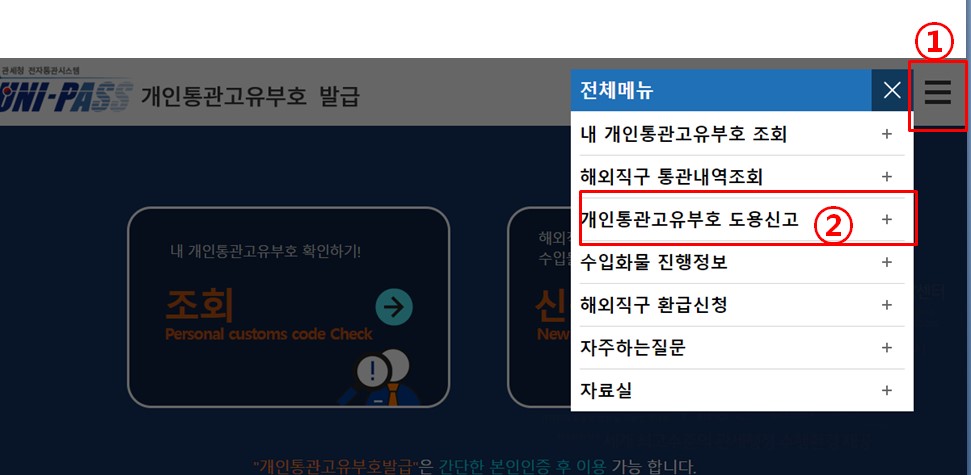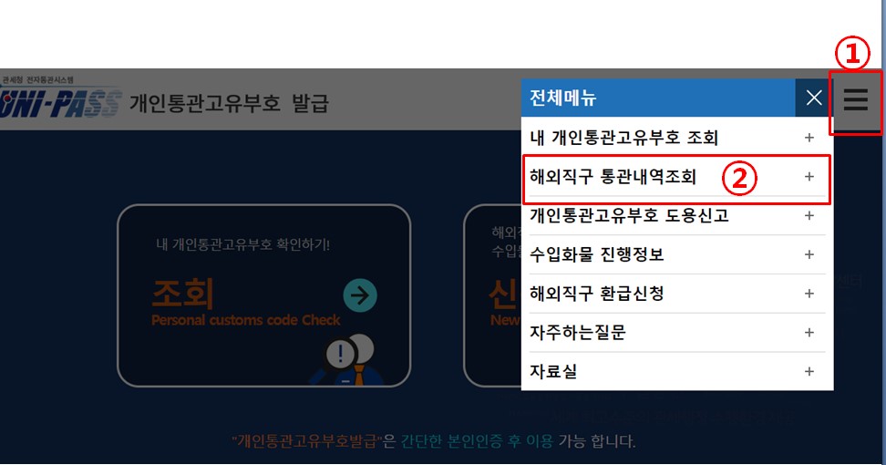 1. UNI-PASS 홈화면에서 오른쪽 상단에 삼선표시인 전체메뉴를 누르면 '해외직구통관내역조회'탭이 보입니다.