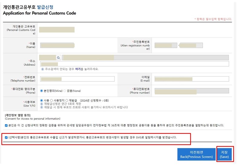 본인의 개인통관고유부로로 해외 수출입 신고가 발생했을 때 SMS로 알림을 받을 수 있다면 안심이 되겠지요?