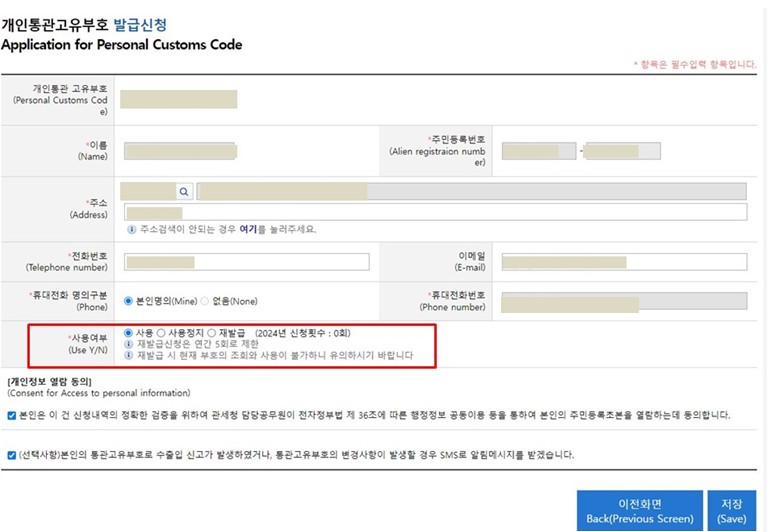 재발급 시 기존의 개인통관고유부호는 더 이상 사용할 수 없게 됩니다.