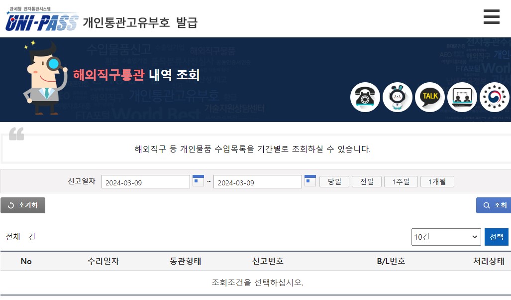 본인의 개인통관고유부호가 도용이 되었는지 확인해 보는 방법 중 하나로 '해외직구통관내역조회'가 있습니다.