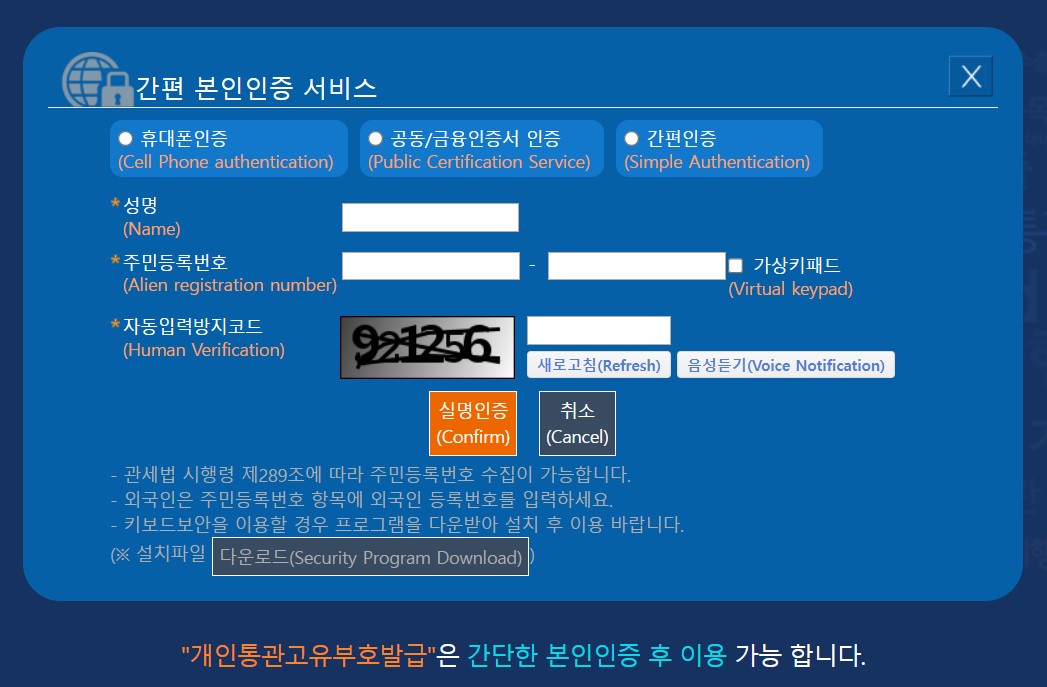 "개인통관고유부호발급"은 간단한 본인인증 후 이용 가능 합니다.