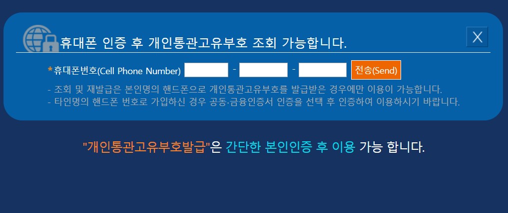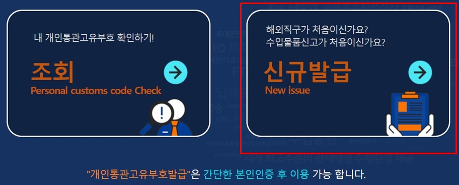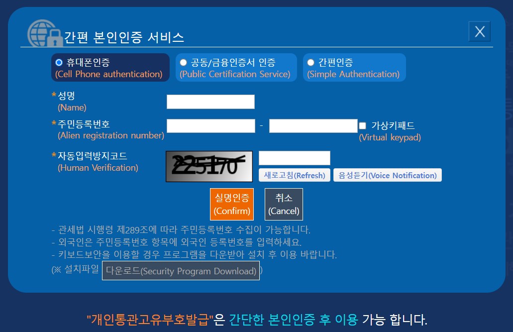"개인통관고유부호발급"은 간단한 본인인증 후 이용 가능 합니다.