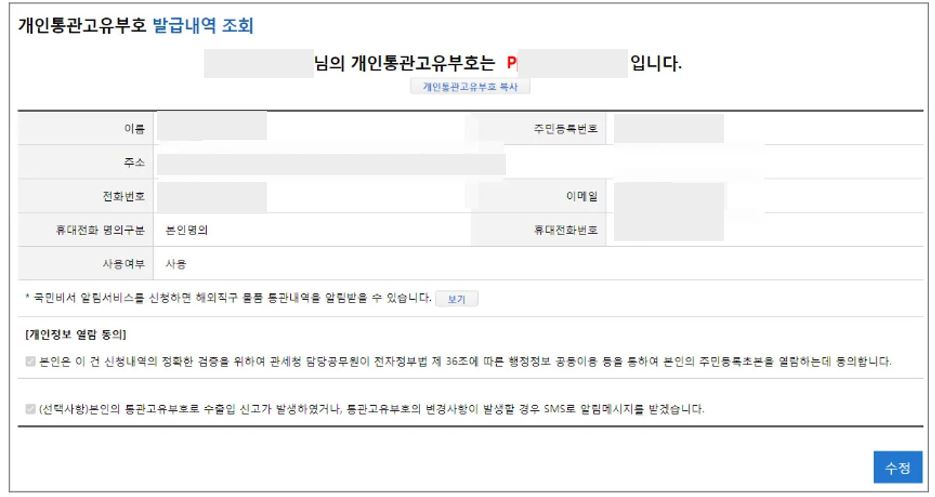 ▷ 잠시 뒤, 개인통관고유부호가 완료되었다는 메시지가 나오며 신규 발급이 완료가 되게 됩니다.