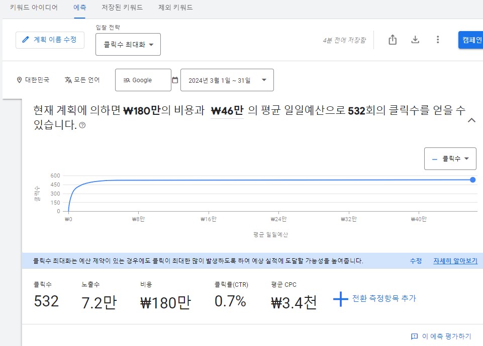 「검색량 및 예상 실적 조회하기」에서는 정해진 키워드를 통해 광고를 게재할 때 한 달간 예상되는 클릭수 및 노출수에 대한 정보를 확인할 수가 있습니다.