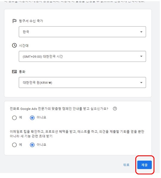 (3) 청구서 수신 국가/시간대/통화 확인하시고, 하단 2개 질문은 저는 '아니요'를 설정하고 우측 하단「제출」을 눌러주었습니다.