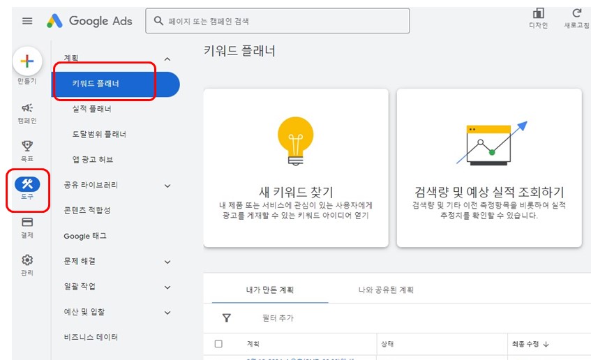 구글애즈 키워드플래너 검색량 및 예상 실적 조회하기 사용 방법
