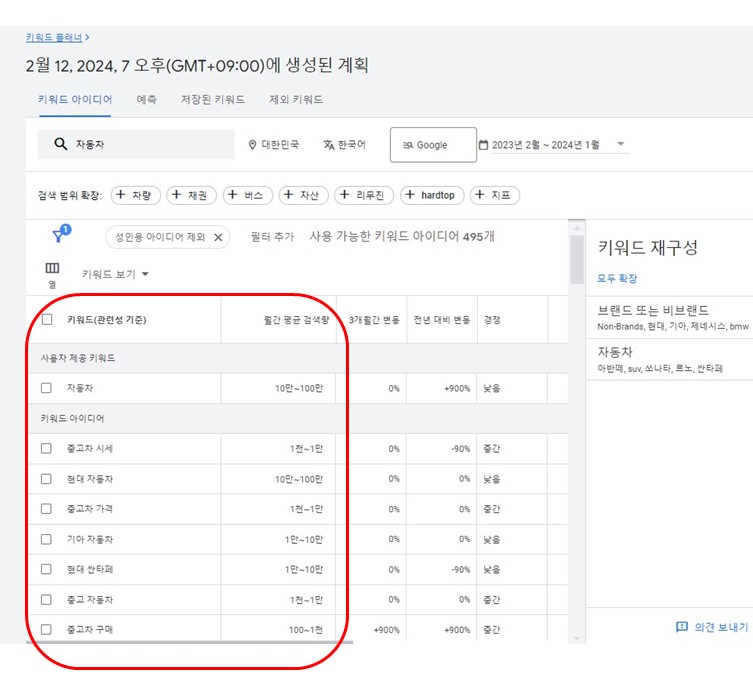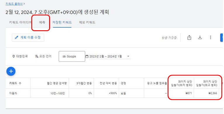 자동차라는 키워드에 대한 "월간 평균 검색량'과 페이지 입찰가 최저범위 및 최고 범위를 확인할 수 있습니다.