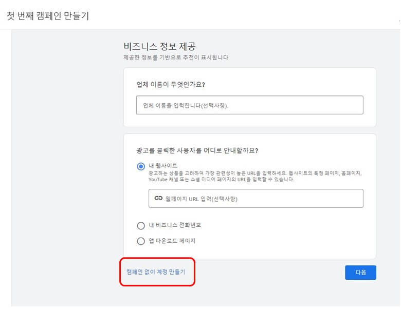 (2) 화면 하단의 「캠페인 없이 계정 만들기」으로 들어가셔야 해요.