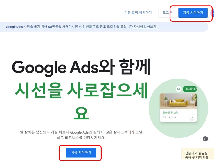 구글 애즈 홈페이지에서 하단이나 상단에 「지금 시작하기」를 눌러주시면 가입하기가 시작됩니다.