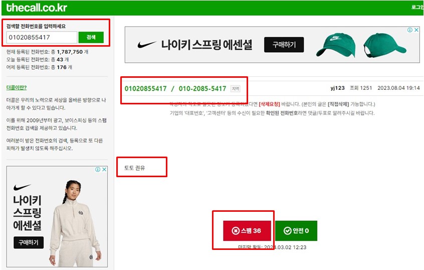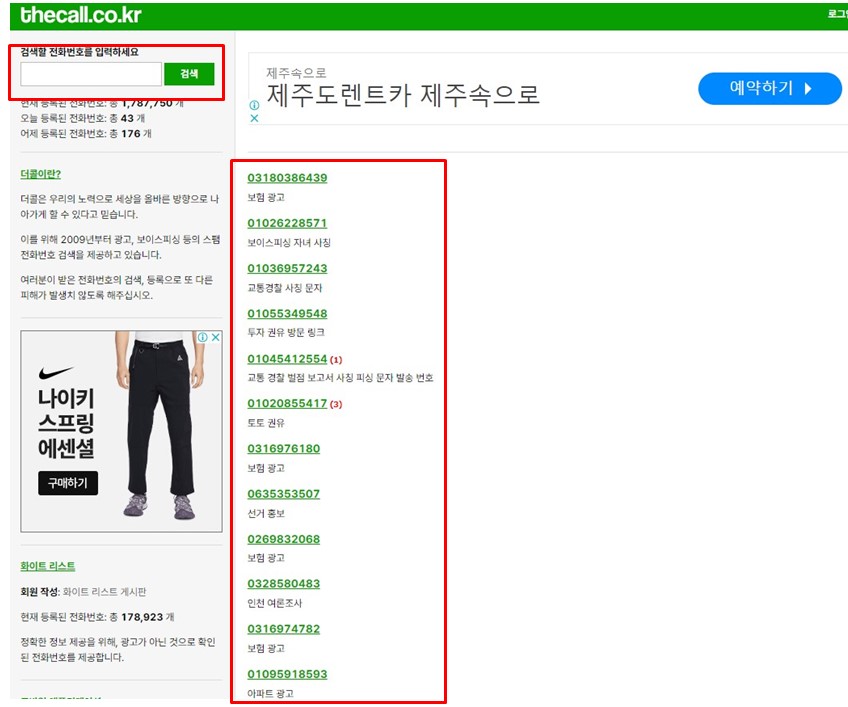 ✅ 네이버 or 다음 등 포털사이트에서 '더콜' 검색하여 들어가면, 이렇게나 많이 이미 등록된 스팸 전화가 보입니다. 로그인을 하지 않아도 검색이 가능하니 더 편리합니다.