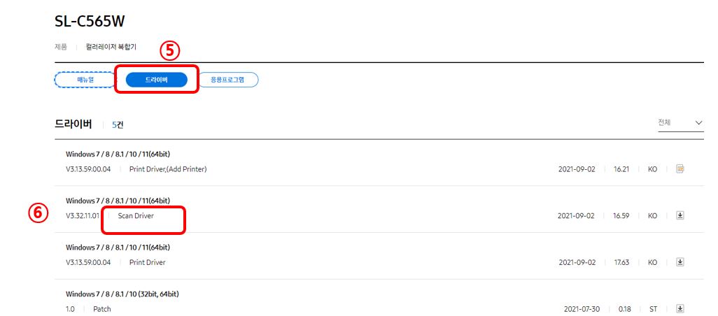 3. SL-C565W 모델명으로 드라이버를 검색한 뒤, 현재 본인이 사용하고 있는 운영체제에 적합한 Scan Driver를 선택하여 설치합니다.