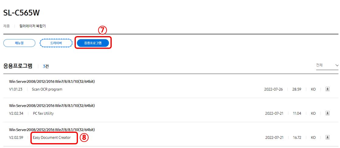 2. 홈페이지 상단 메뉴 중 서비스안내 ▷ 자료실로 들어가서 검색란에 모델명 SL-C565W를 입력해 「Scan Driver프로그램」과 「Easy Document Creator프로그램」를 설치하세요.