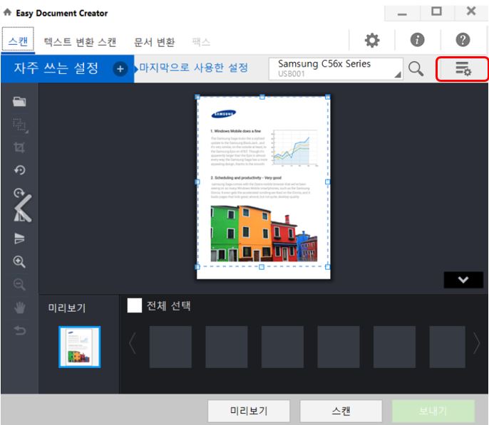 3. 이제, Samsung Easy Document Creator 화면에서 왼쪽 끝의 스캔 버튼을 선택합니다.