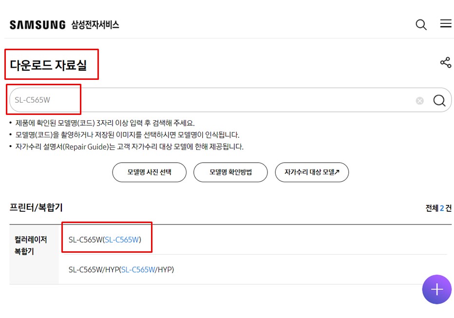 1. 먼저, 삼성의 고객서비스 페이지에 접속하여 서비스안내 ▷ 다운로드 자료실에 들어가서 ▷ 검색창에 SL-C565W 모델명을 검색합니다. 그럼, SL-C565W와 SL-C565FW 두 가지의 모델이 화면에 보이게 됩니다.
