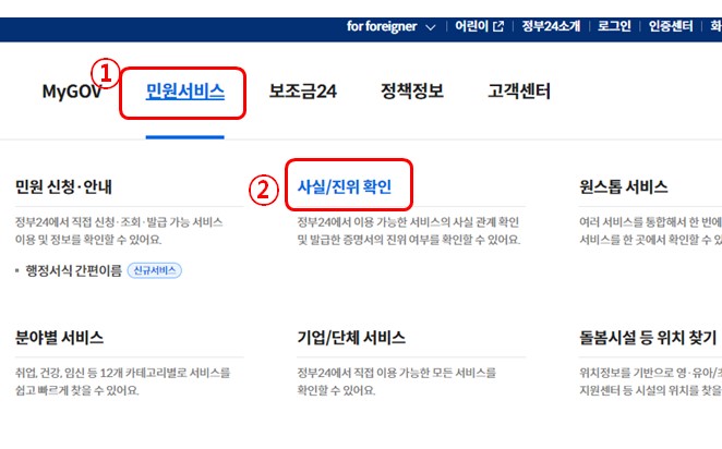 4. '14세 미만 이용자 회원가입 승인 안내' 문자를 받고 난 뒤 > 민원서비스 > 사실/진위 확인을 눌러 자녀확인버튼을 눌러 주세요.