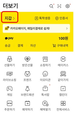 2. 더보기 안에 노란 박스가 보입니다. 노란 박스 안 상단에 '지갑>'을 눌러주세요.