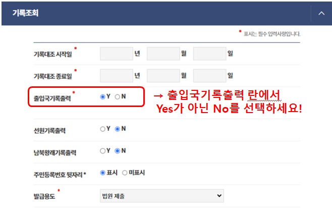 출입국 기록이 없다면? ➡️ 출입국기록출력 란에서 Yes가 아닌 No를 선택하세요!