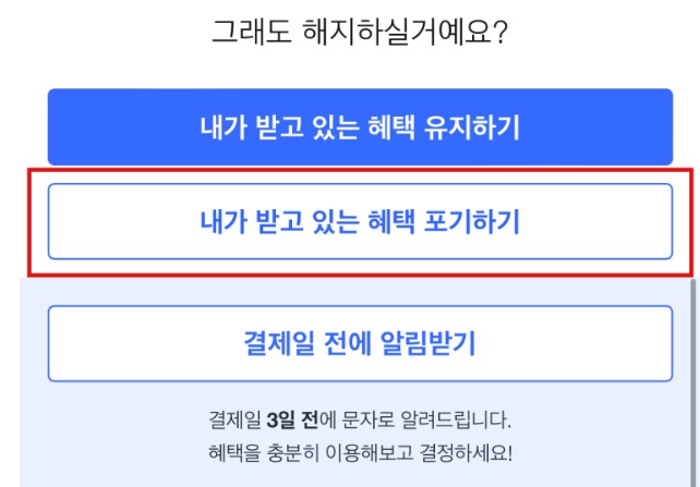 4. 그래도 해지하실거에요? 라고 물으면 '내가 받고 있는 혜택 포기하기'를 선택해 주세요.