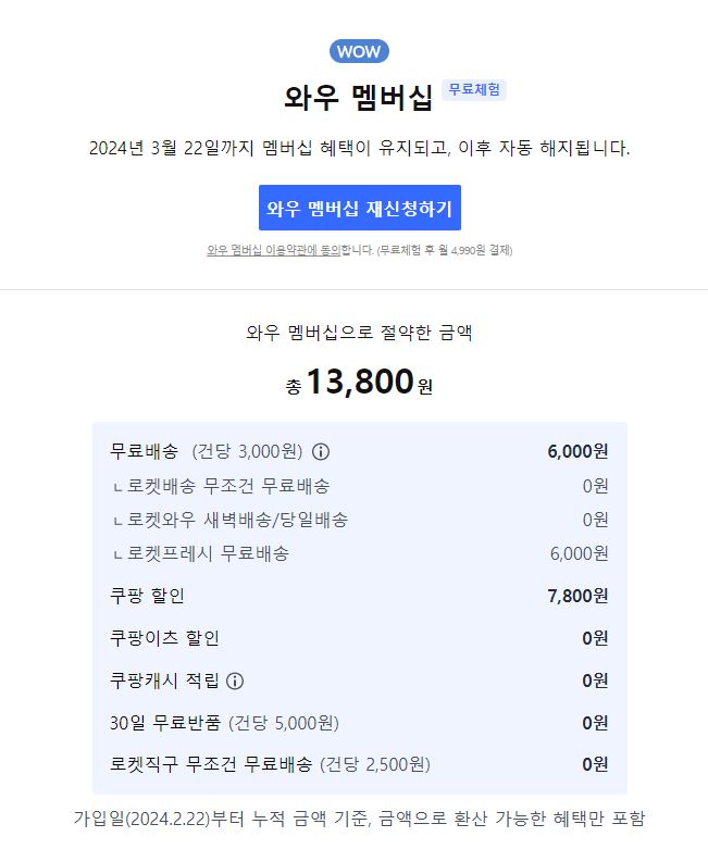 저는 쿠팡와우멤버십을 무료 30일을 사용해 봤었는데요. 무료체험 30일 동안 무료배송으로 배송비 절약과 제품 할인 등 13,800원 이득을 취했더군요.